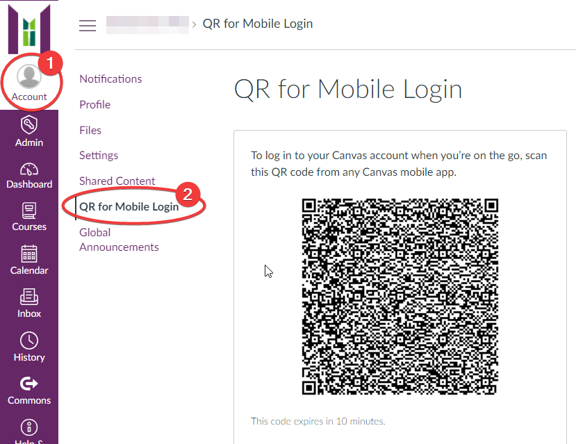 2. Login to the Canvas website from a PC or Mac. As shown below, select Account (1) and QR for Mobile Login (2) to display your personal login QR code which expires after 10 minutes.